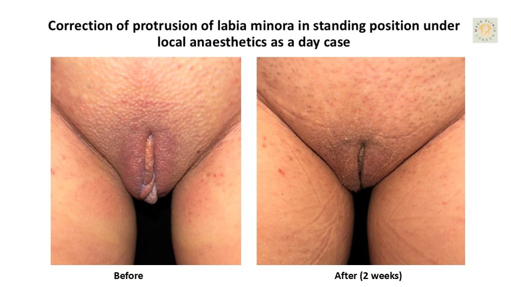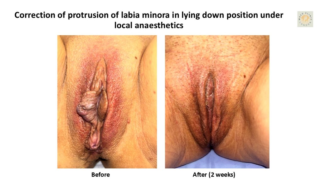 - Asymmetries of the other adjoining parts of the external genitalia become more visible to patients once the enlarged part of labia minora has been removed.