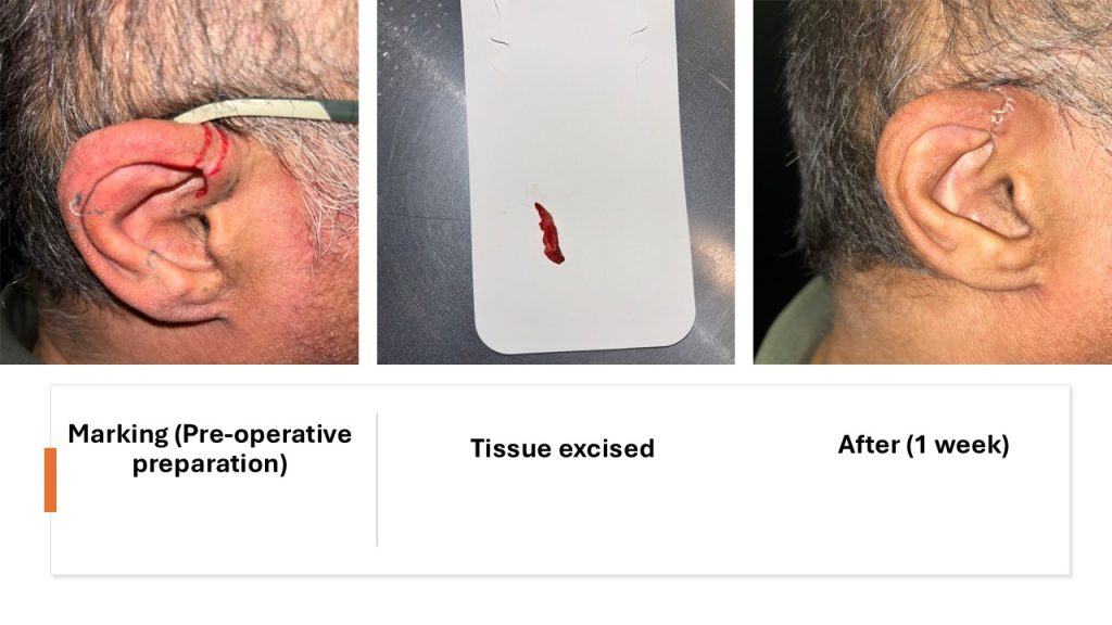 The correction of the prominent ears can be performed by sculpturing the natural fold ( antihelical fold) in the upper pole by using sutures within the ear cartilage . The width between the side of the head and the ear can be narrowed by sutures between them. This technique is known as ‘suture technique’.Many surgeons would prefer weakening the ear cartilage ( scoring technique ) to reconstruct the natural fold of the upper pole. The procedure is done by making a cut in the back of the ear ( retro-auricular space). The size of the ear/ lobule can be reduced at the time of prominent ear correction if required (Conchal reduction/ear lobule reduction). Local anaesthetic is preferred in adult patients. It is safe and also cost-effective. Children between 5 and 15 years will require general anaesthetics.